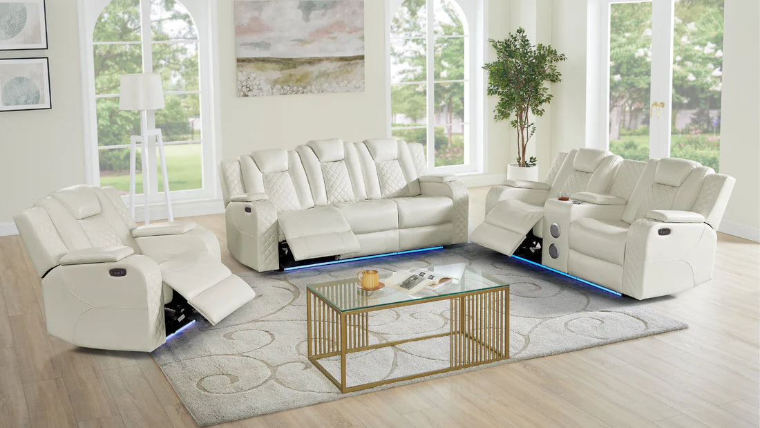 LOVESEAT: POWER RECLINING, CONSOLE W/STORGE, CUPHOLDER, BLUETOOTH SPEAKERS, ARM STORAGE, USB CHARGER, TYPE C, AND LED LIGHT.