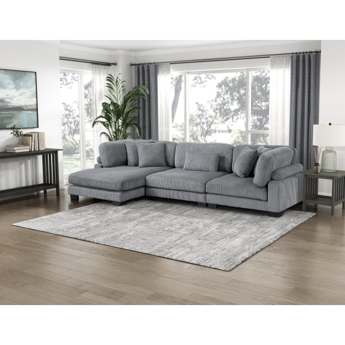The 3-piece sectional configuration consists of one corner unit paired with one armless chair, and a chaise.
